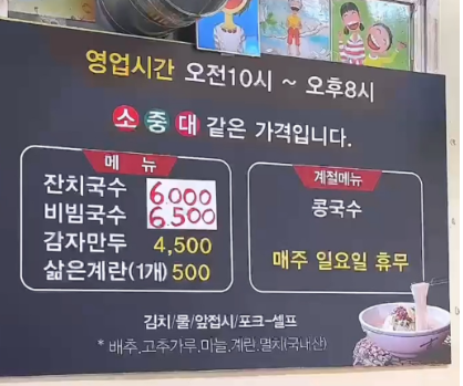 <비빔국수 6,500원 / 잔치국수 6,000원 / 삶은 계란 500원>
